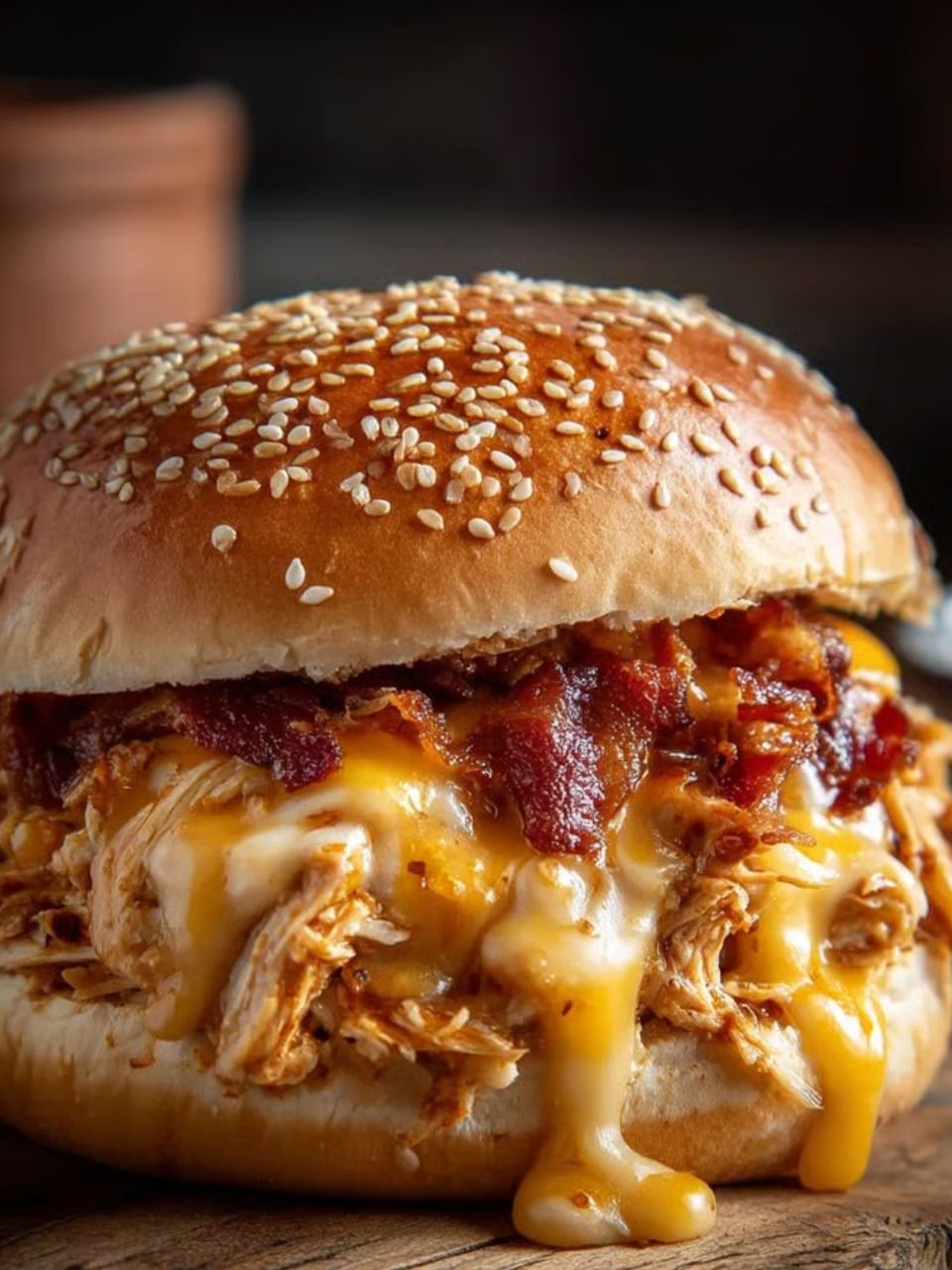 A sandwich with bacon and cheese on a bun.