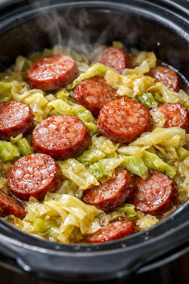 This four-ingredient slow cooker sausage and cabbage is one of those cozy, no-fuss dinners that feels like a hug at the end of a long day. It’s a simple spin on the old-fashioned cabbage-and-sausage skillet meals so many of our grandmas made, but with the ease of a slow cooker and the smoky flavor of kielbasa. Everything goes into the pot, you walk away, and a few hours later you’ve got tender cabbage, juicy sausage, and a broth that tastes like it’s been simmering on the stove all afternoon. It’s the kind of recipe you make when you want something hearty, budget-friendly, and family-pleasing without hovering over the stove.