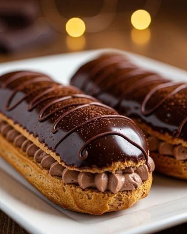 11. Dip the tops of the filled eclairs in the chocolate glaze, allowing any excess to drip off.