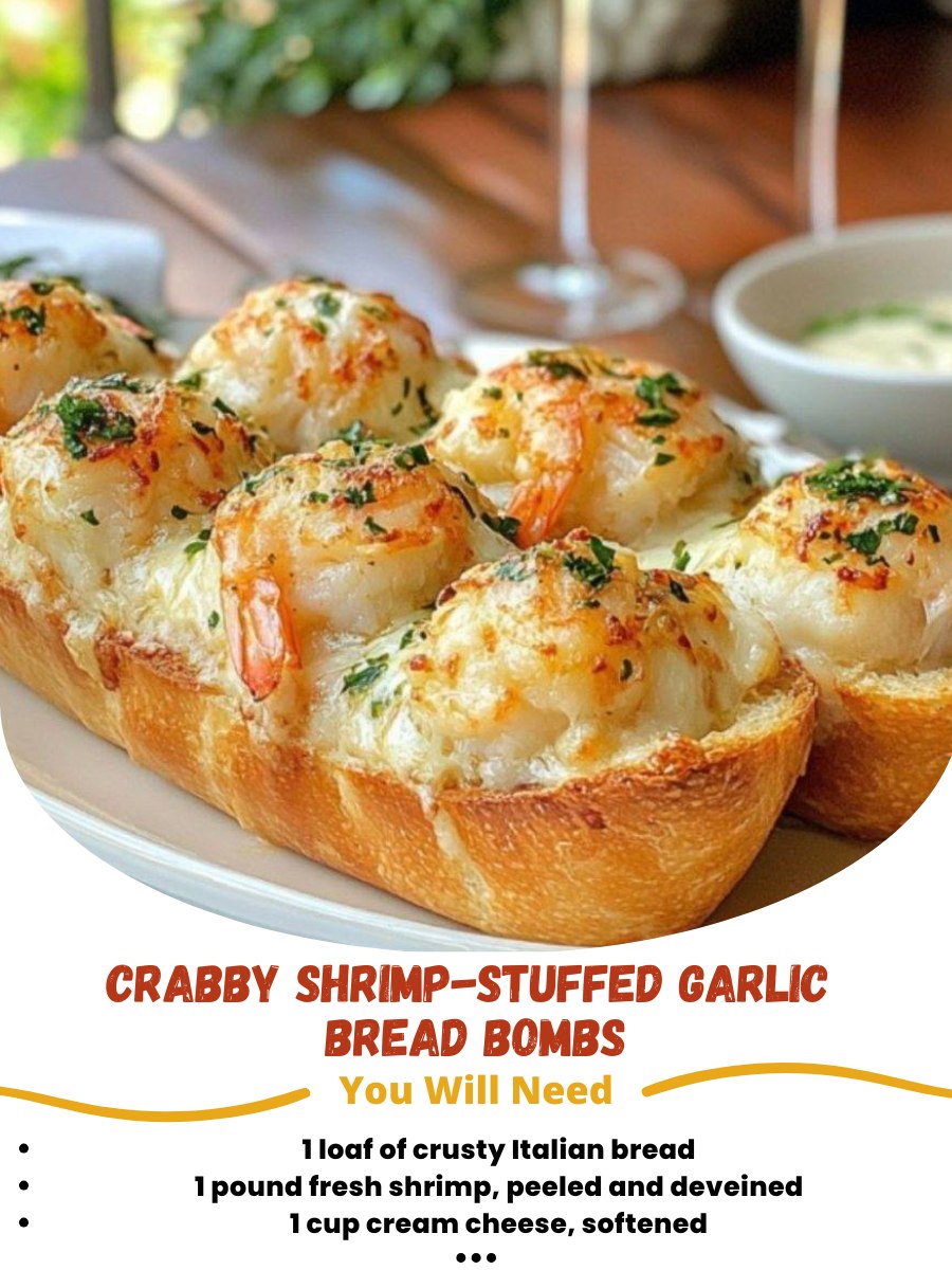 These incredible crabby shrimp-stuffed garlic bread bombs transform ordinary Italian bread into an extraordinary appetizer that delivers succulent seafood, creamy cheese, and aromatic garlic in every indulgent bite. The genius lies in hollowing out crusty bread to create the perfect vessel for a rich filling of tender shrimp, luxurious cream cheese, and melted mozzarella that bubbles and melts into pure comfort food perfection. Each golden-brown bomb offers the irresistible contrast of crispy, buttery exterior giving way to a warm, creamy seafood center that makes this dish an instant crowd-pleaser for any gathering from casual game days to elegant dinner parties.