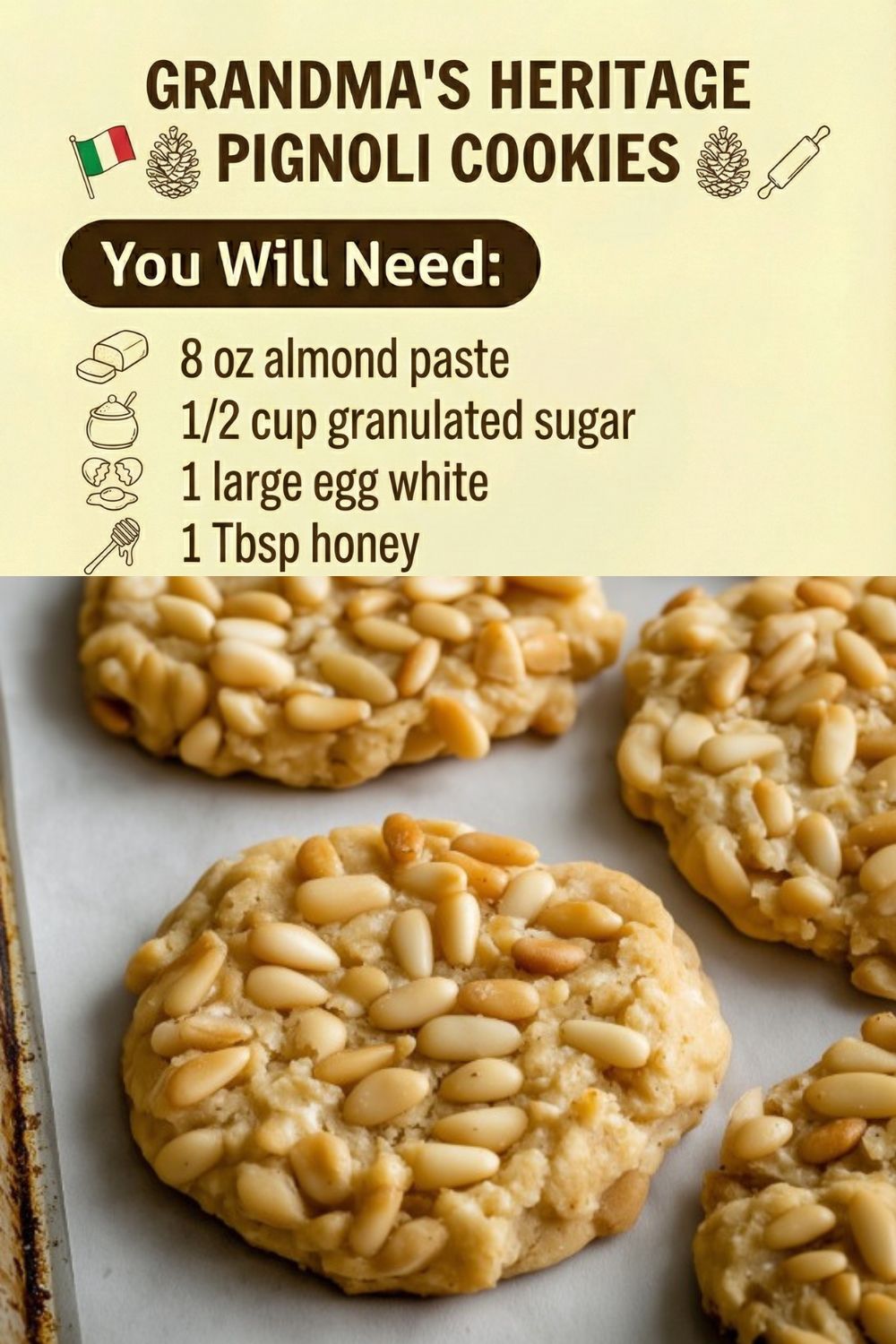 For Grandma’s Heritage Pignoli Cookies, you will need the following ingredients:
