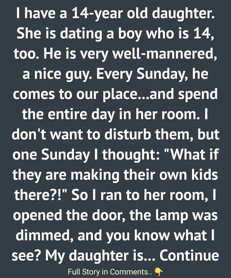 Every Sunday, he visits, and the two of them spend hours in her room. I remind myself they’re just hanging out, but when the giggles get quieter and the door stays firmly shut, my imagination starts to wander.