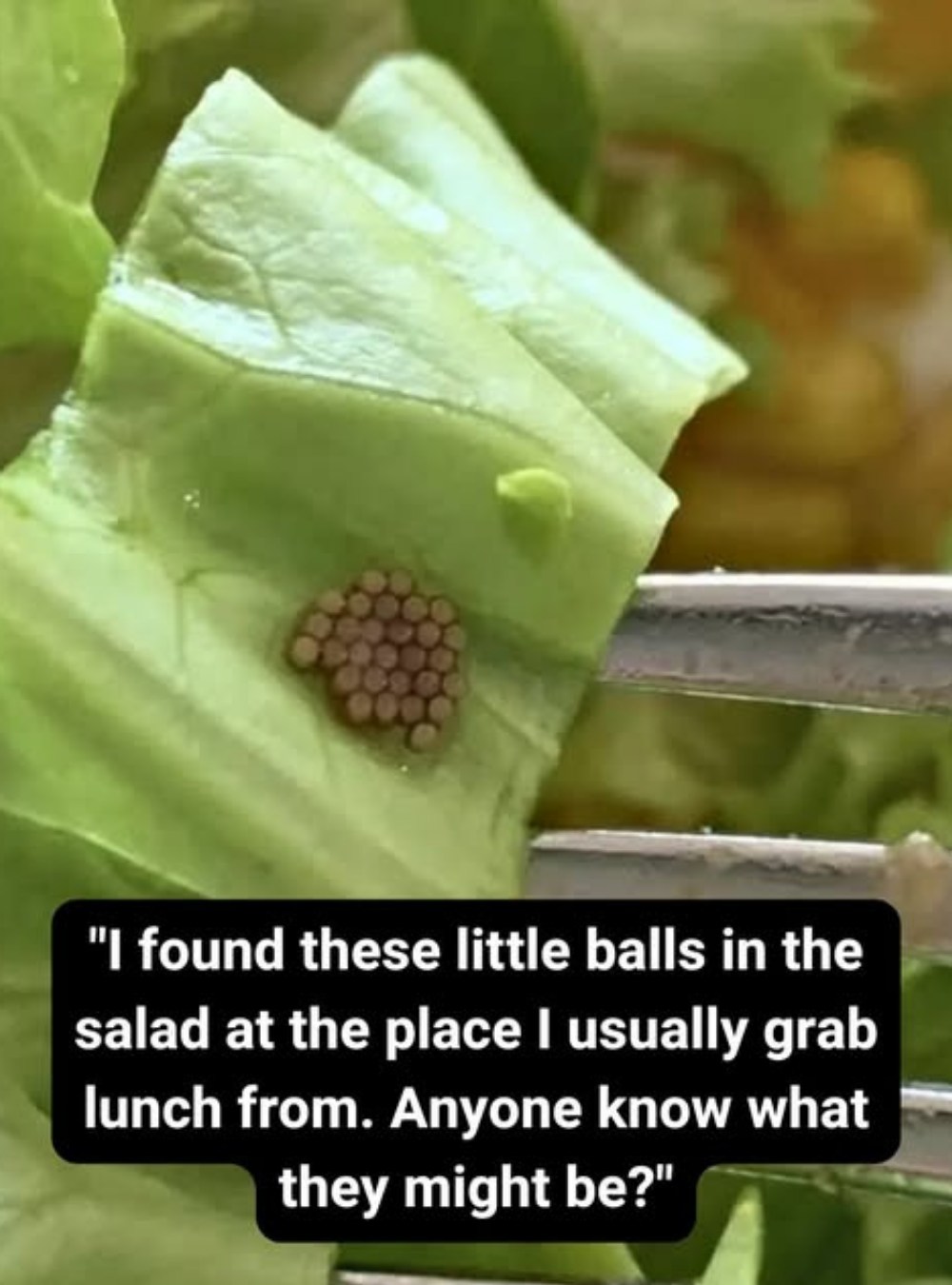 It happened during an ordinary lunch break, the kind where meals are eaten quickly and without much thought. She sprinkled what she believed were grains of quinoa onto her salad, barely noticing how the small brown shapes blended in with the leafy greens. But after a few bites, something caught her eye. The pieces looked too uniform, too tightly clustered, and oddly attached to a lettuce leaf. She paused, leaned closer—and immediately realized something was wrong. They weren’t grains at all. The moment of recognition was unsettling, and she stopped eating instantly.