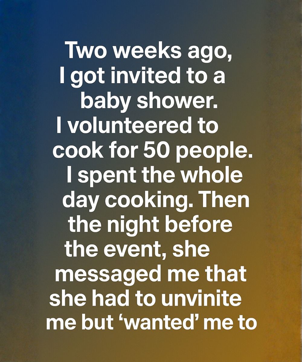The host sent me a cheerful message saying I was “uninvited” because of “space issues” — yet she still wanted me to drop off all the food. No apology, no explanation — just casual instructions, as though my time and care were hers to claim. I stared at my phone, stunned. Kindness shouldn’t feel like being used, but in that moment, it did.